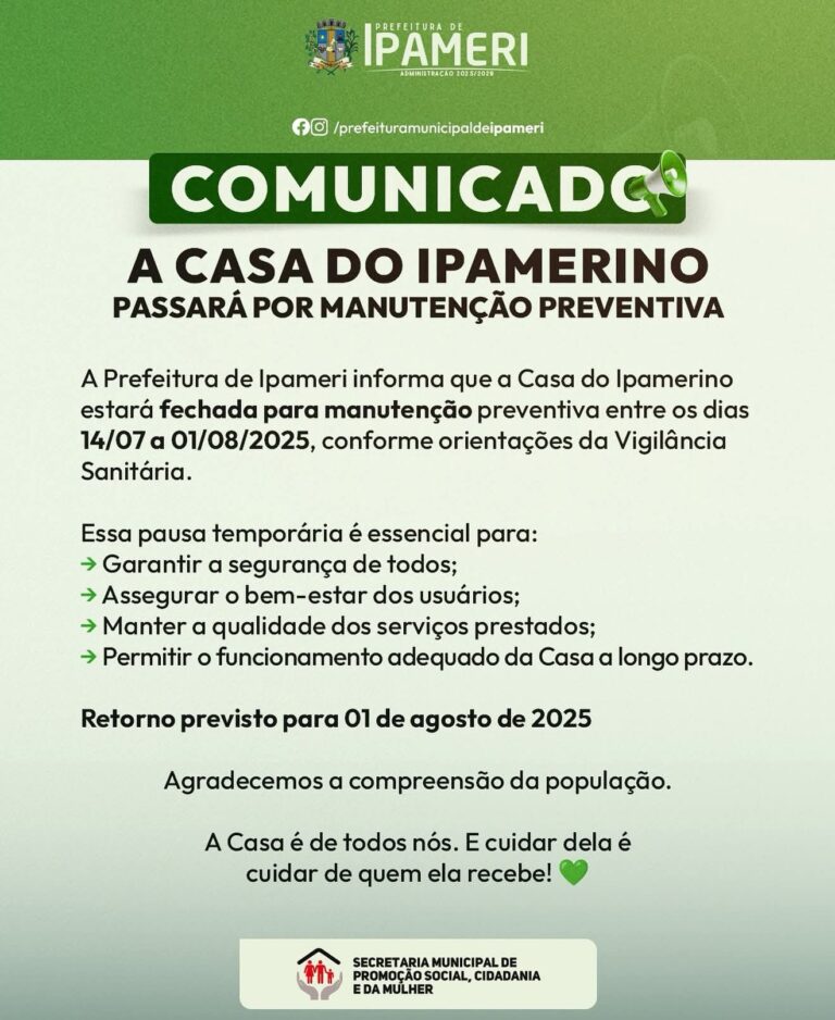 A Prefeitura Municipal de Ipameri, por meio da Secretaria de Promoção Social, Cidadania e da Mulher, informa à população que a Casa do Ipomerino estará fechada temporariamente no período de 14 de julho a 1º de agosto, para realização de manutenção preventiva, em conformidade com as normas da Vigilância Sanitária.