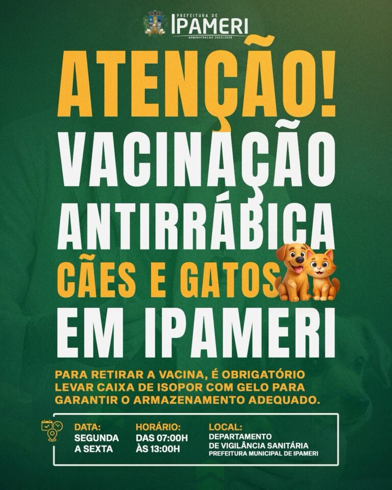 A Prefeitura Municipal de Ipameri, por meio do Departamento de Vigilância Sanitária, informa à população que está disponível a vacina antirrábica, destinada à prevenção da raiva em cães e gatos.