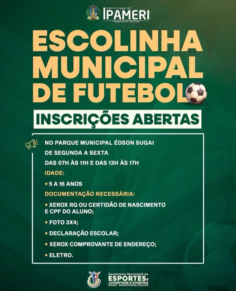 A Prefeitura de Ipameri, por meio da Secretaria Municipal de Esportes Juventude e Eventos informa que estão abertas as inscrições para a Escolinha Municipal de Futebol.