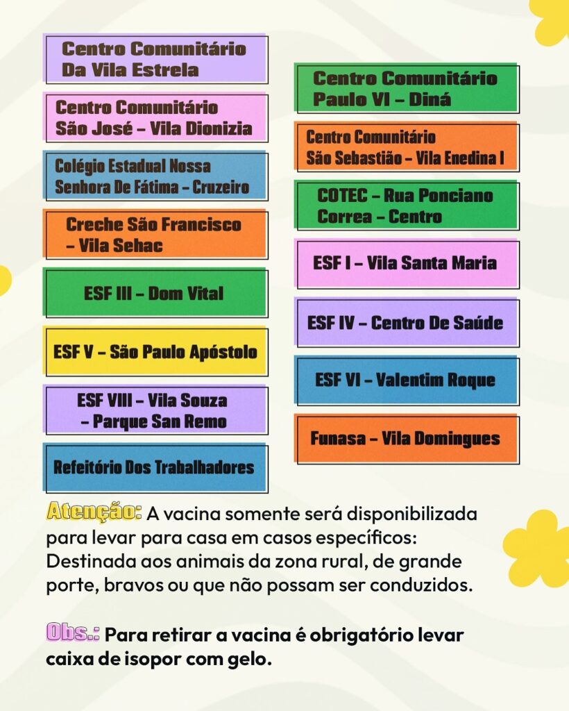 Observação: A Vacina somente será disponibilizada para levar para casa: para os animais da Zona Rural, de grande porte, bravos e que não podem ser conduzidos. Para adquirir a vacina é obrigatório levar caixa de isopor com