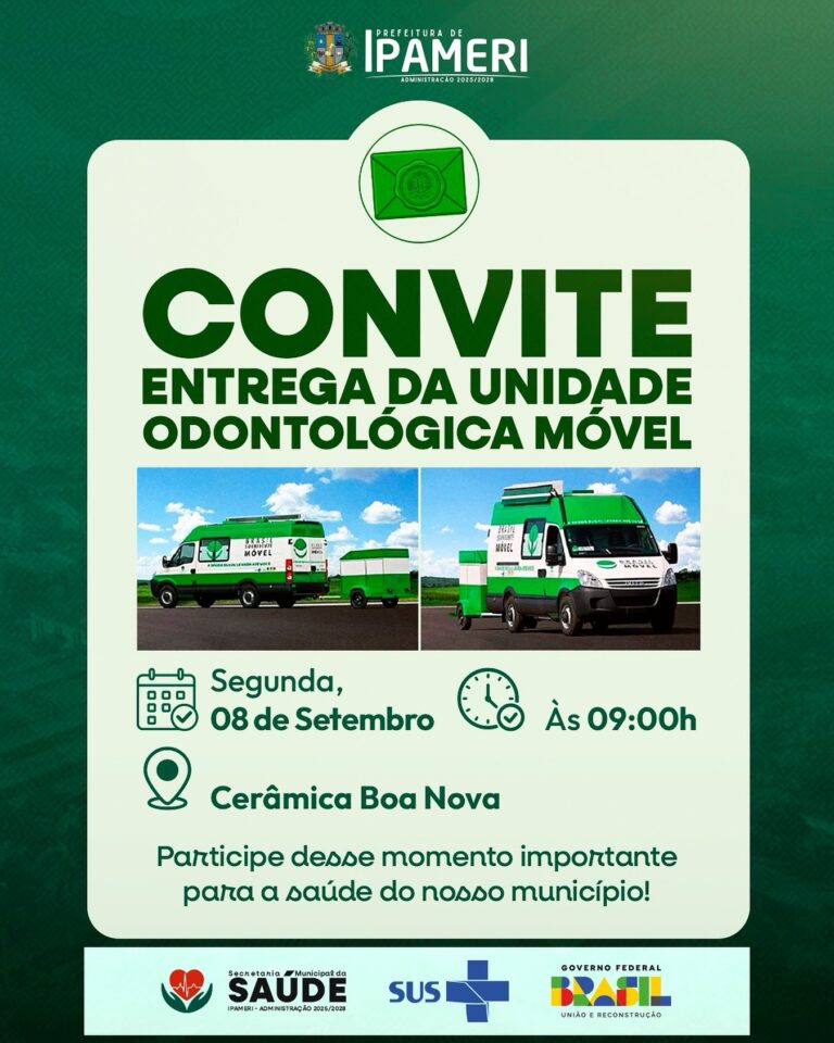 A Prefeitura, por meio da Secretaria Municipal de Saúde, convida toda a população para a entrega da Unidade Odontológica Móvel (UOM), que levará atendimentos de saúde bucal a quem mais precisa.