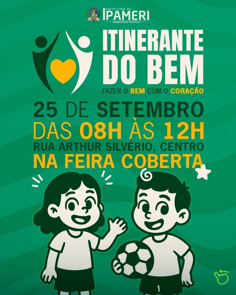 A Prefeitura de Ipameri, por meio da Secretaria de Promoção Social, realiza no dia 25 de setembro, das 8h às 12h, na Feira Coberta Isidoro Rodrigues (Rua Arthur Silvério, Centro), mais uma edição do Programa Itinerante do Bem.