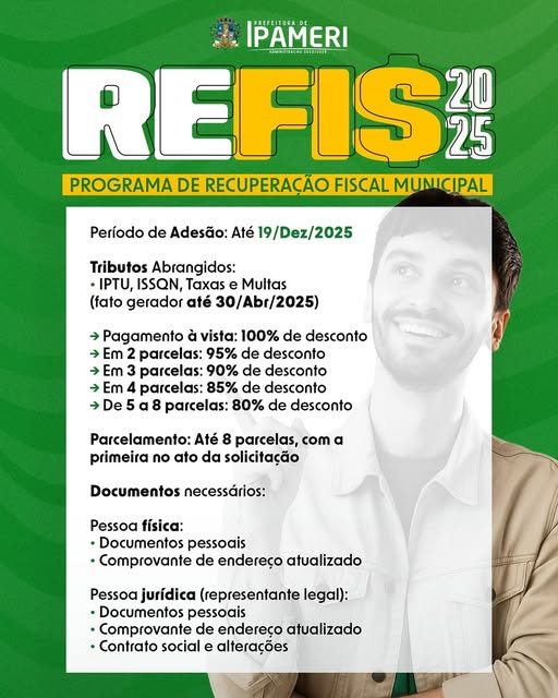 A Prefeitura de Ipameri, por meio da Secretaria Municipal de Administração, informa que está aberto o período de adesão ao Programa de Recuperação Fiscal (REFIS) 2025. Os contribuintes podem aderir até 19 de dezembro.