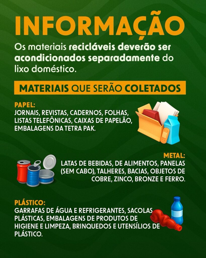 Os materiais recicláveis deverão ser acondicionados separadamente do lixo doméstico, são esses: