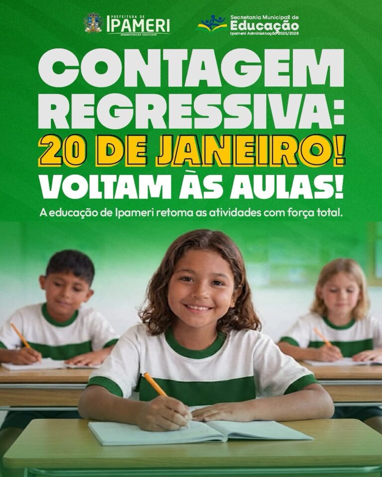 A Prefeitura de Ipameri, por meio da Secretaria Municipal de Educação, informa que as aulas na rede municipal de ensino terão início na próxima terça-feira, 20 de janeiro. 🎒