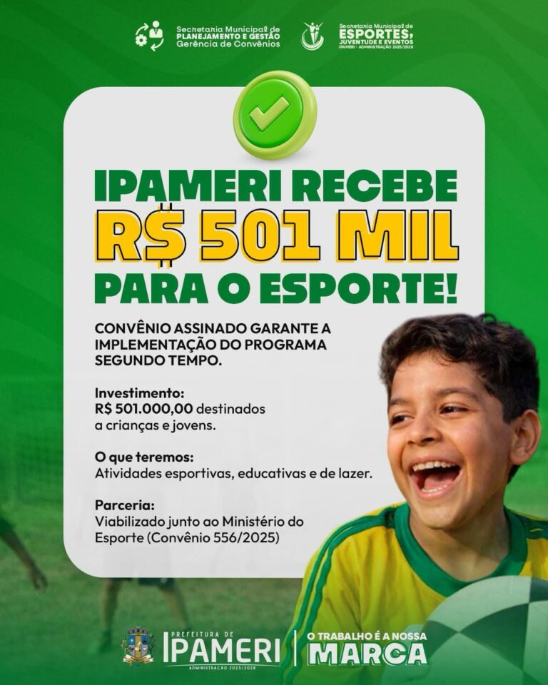 A Prefeitura Municipal de Ipameri, por meio da Secretaria de Planejamento e Gestão, em parceria com a Secretaria de Esporte, Juventude e Eventos e a Secretaria de Educação, firmou o Convênio nº 556/2025 para a implementação e desenvolvimento do Programa Segundo Tempo.