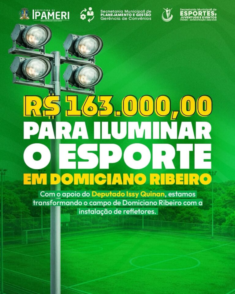 A Prefeitura Municipal de Ipameri, por meio da Secretaria Municipal de Planejamento e Gestão e da Secretaria de Esportes, Juventude e Lazer, celebrou convênio para a implantação de refletores no campo de futebol do Distrito de Domiciano Ribeiro, fortalecendo a infraestrutura esportiva do município.