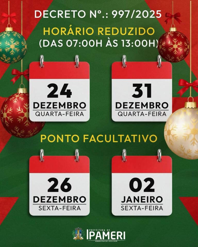 De acordo com o Decreto n°.: 997/2025 fica estabelecido: Art 1º –⏰ Horário de funcionamento das repartições públicas nos dias 24 e 31 de dezembro de 2025 das 07:00 às 13:00 horas. Art. 2° –📌 Fica estabelecido ponto facultativo para…